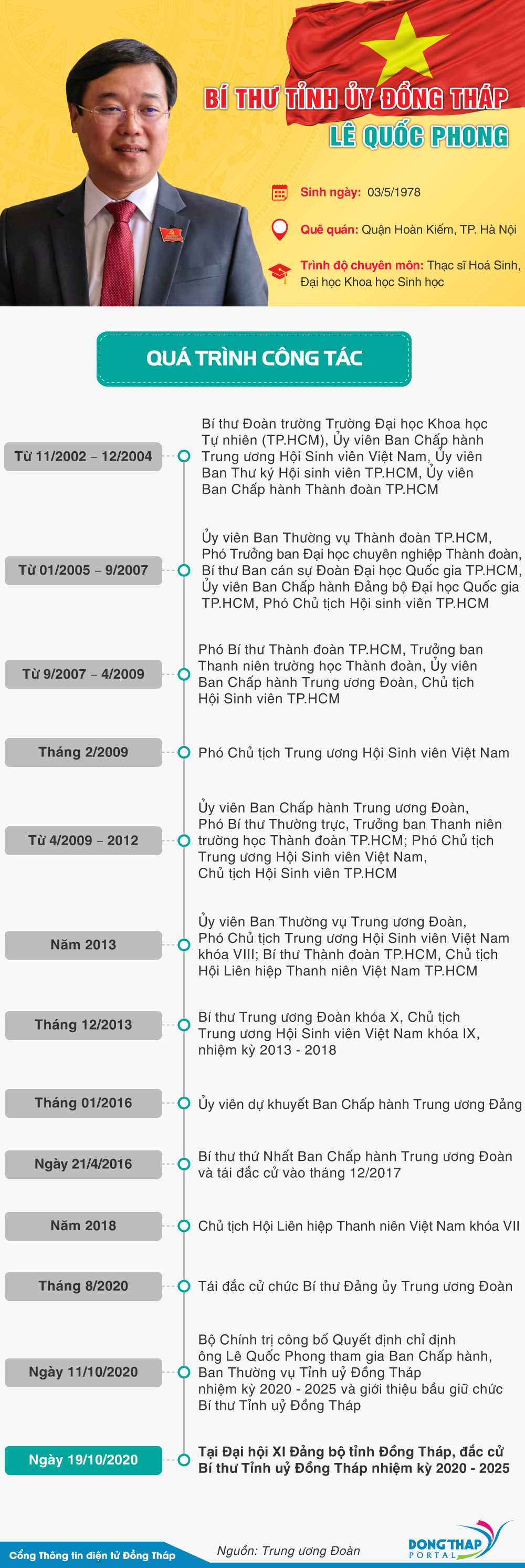 Tại Hội nghị lần thứ nhất, Ban Chấp hành Đảng bộ tỉnh khoá XI, đồng chí Lê Quốc Phong - Uỷ viên dự khuyết Ban Chấp hành Trung ương Đảng, nguyên Bí thư thứ nhất Trung ương Đoàn đã đắc cử Bí thư Tỉnh uỷ Đồng Tháp nhiệm kỳ 2020 - 2025, với số phiếu tuyệt đối. Mời xem chân dung tân Bí thư Tỉnh uỷ Đồng Tháp tại Infographic dưới đây.