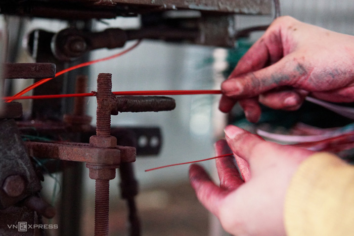 Thợ dệt đưa từng sợi lát vào máy, tùy chỉnh cho đúng hoa văn mỗi tấm chiếu. Công việc đòi hỏi sự tập trung, cẩn thận.