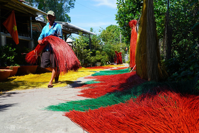 Sợi lát đã nhuộm màu, phơi khoảng một ngày sẽ khô. Có bốn màu chính làm nên độ rực rỡ của tấm chiếu là đỏ, xanh, vàng kết hợp với màu trắng ngà tự nhiên của sợi lát.