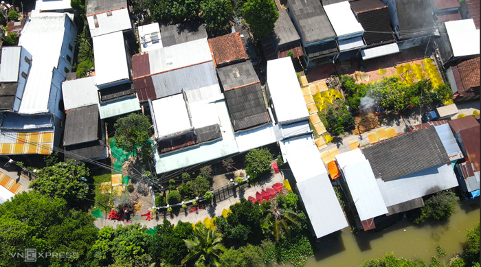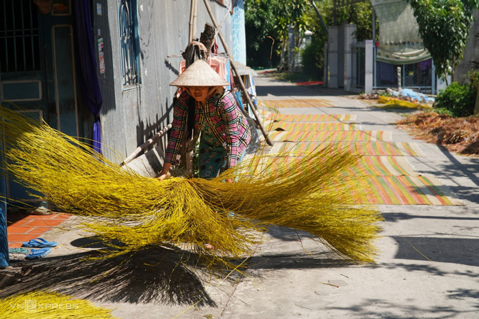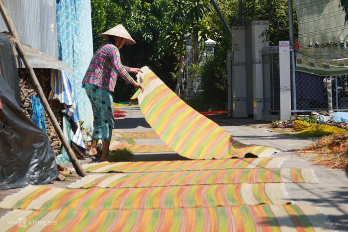 Chiếu dệt xong phơi qua vài nắng để chống ẩm mốc. Nhiều tuyến đường vì thế cũng rực rỡ sắc màu