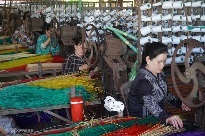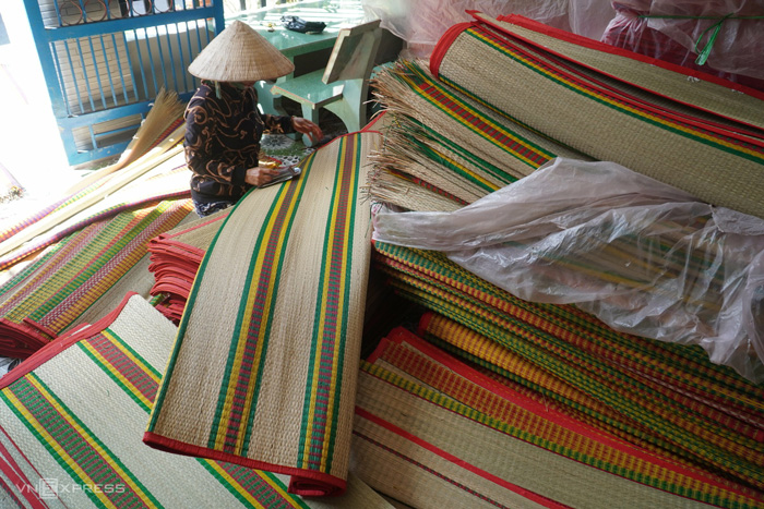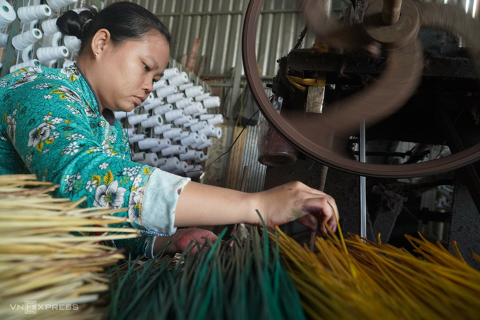 Bà Vàng, thợ dệt chiếu, cho biết mỗi ngày dệt được 10 chiếc, tiền công 150.000 đồng. Dệt máy đòi hỏi phải quan sát kỹ, biết cách vận hành. Nhìn vậy nhưng không dễ.