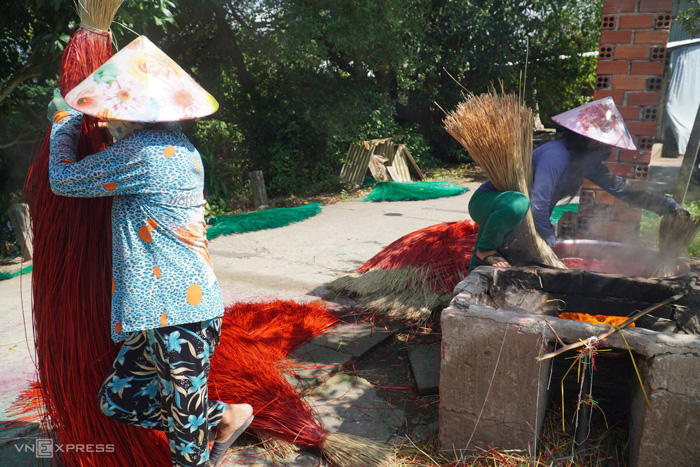 Bà Nguyễn Kim Vân (trái), làm chiếu hơn 30 năm, cho biết mùa Tết bắt đầu từ tháng 10 âm lịch. Gia đình bà thức khuya dậy sớm để nhuộm và dệt chiếu, kịp cung ứng cho thương lái.