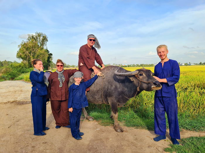 Du khách trải nghiệm chăn trâu tại Viet Mekong Farmstay. Ảnh: Cuộc thi sáng kiến Mekong