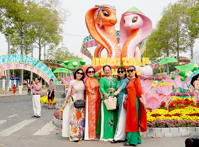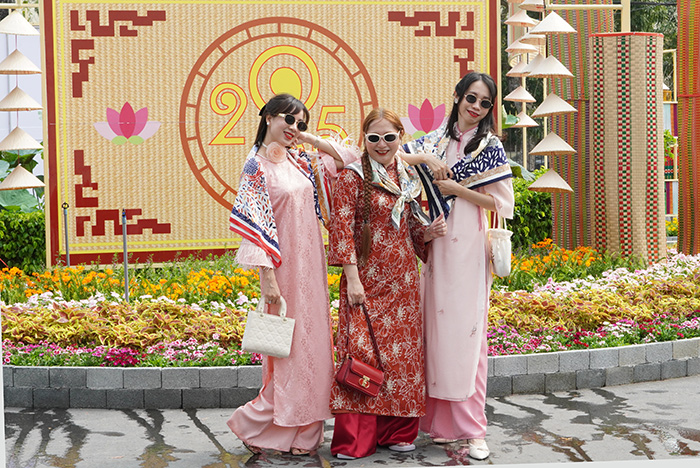 Nụ cười rạng rỡ, trang phục áo dài truyền thống và những bức ảnh chụp bên đại cảnh linh vật của năm Ất Tỵ tạo nên không khí xuân tràn ngập niềm vui