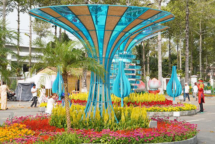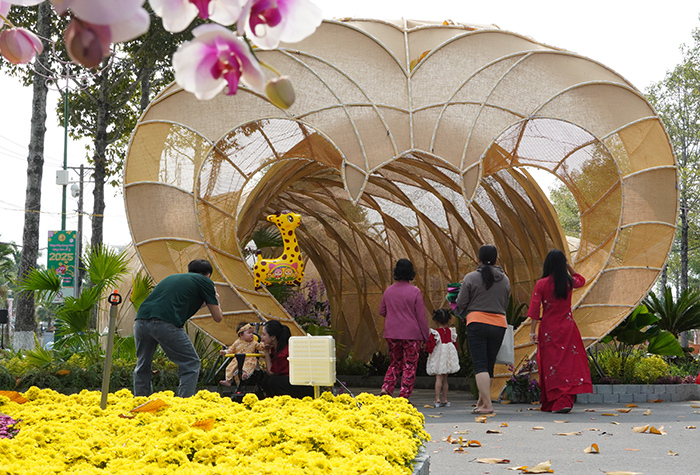 Đường hoa xuân còn là nơi hội tụ các giá trị văn hóa truyền thống, trong đó có tiểu cảnh được trang trí bằng chiếu - sản phẩm của làng nghề Dệt chiếu Định Yên (Lấp Vò – Đồng Tháp)