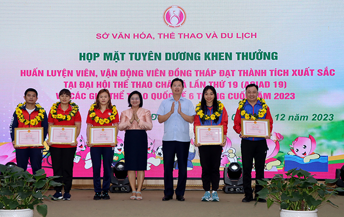 Dịp này, Phó Chủ tịch Uỷ ban nhân dân tỉnh Huỳnh Minh Tuấn trao Bằng khen của Chủ tịch Uỷ ban nhân dân tỉnh cho 03 tập thể, 03 cá nhân đã có nhiều đóng góp cho sự phát triển thể thao tỉnh Đồng Tháp; trao Bằng khen cho các vận động viên, huấn luyện viên đạt thành tích xuất sắc tại các giải thể thao quốc tế năm 2023.