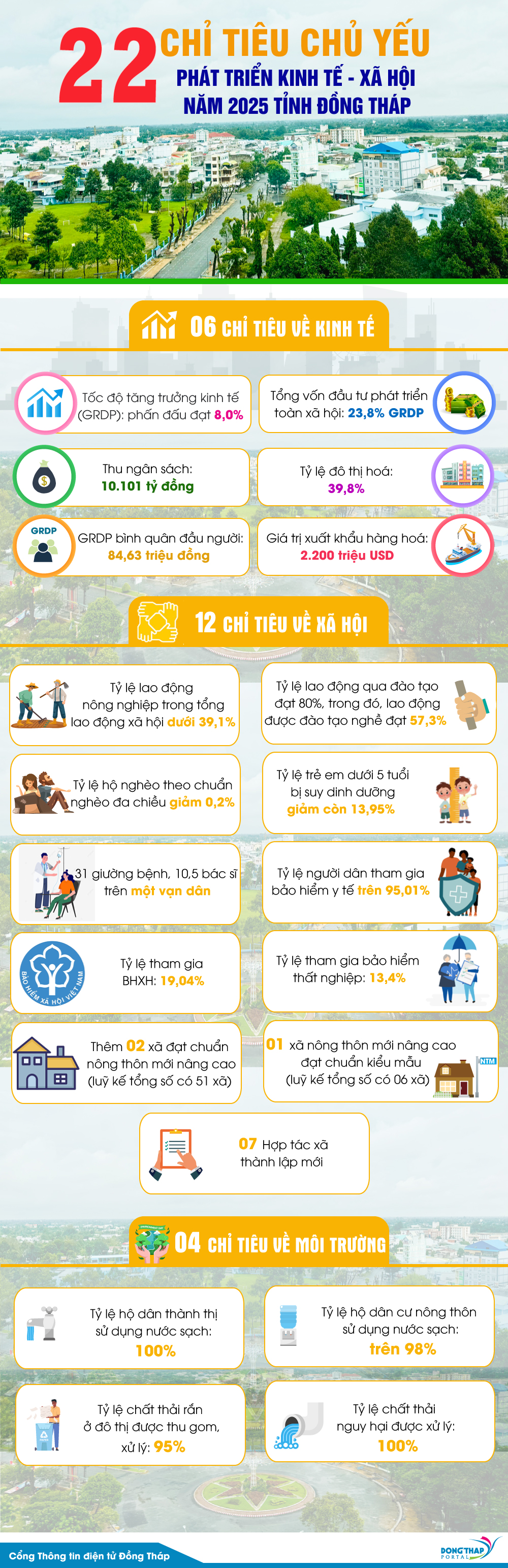 Phát huy những thành tựu kinh tế - xã hội đạt được năm 2024, tỉnh Đồng Tháp đặt mục tiêu tiếp tục phát triển kinh tế nhanh và bền vững, trong đó phấn đấu tốc độ tăng trưởng kinh tế (GRDP) phấn đấu đạt 8,0% trong năm 2025, cùng nhiều chỉ tiêu trọng yếu khác. Chi tiết xem Infographic dưới đây: