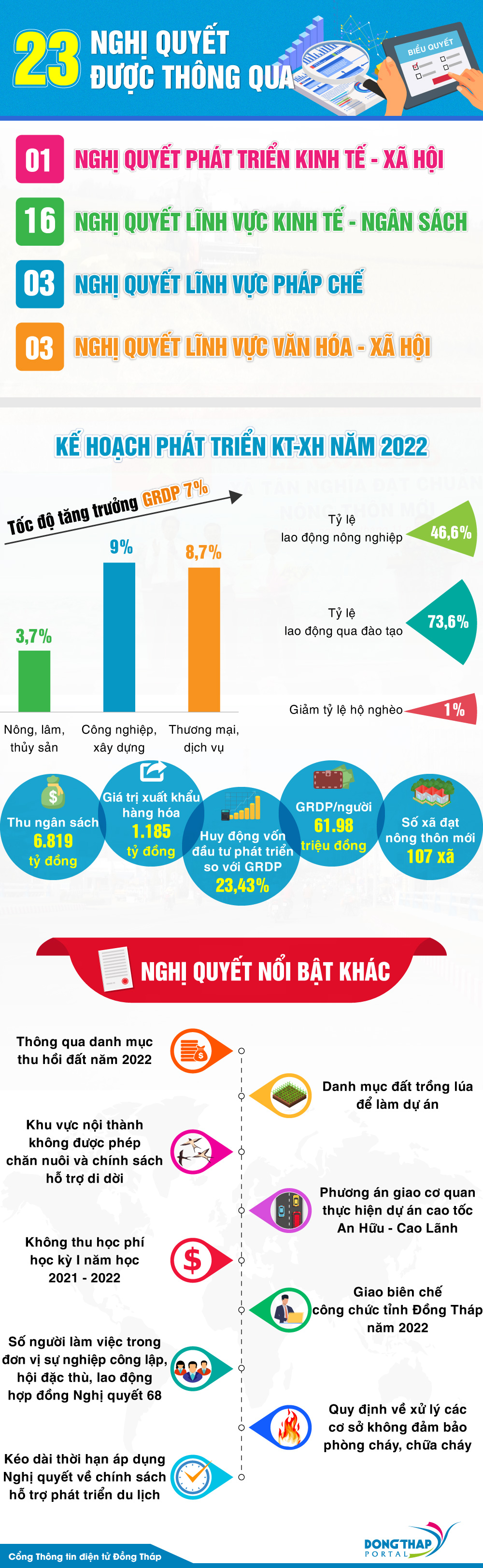 Tại kỳ họp thứ 3, Hội đồng nhân dân tỉnh Đồng Tháp (từ ngày 08 – 09/12) đã thông qua 23 Nghị quyết quan trọng, liên quan trực tiếp đến đời sống xã hội của người dân và sự phát triển của tỉnh nhà. Mời xem infographic dưới đây về một số Nghị quyết nổi bật.