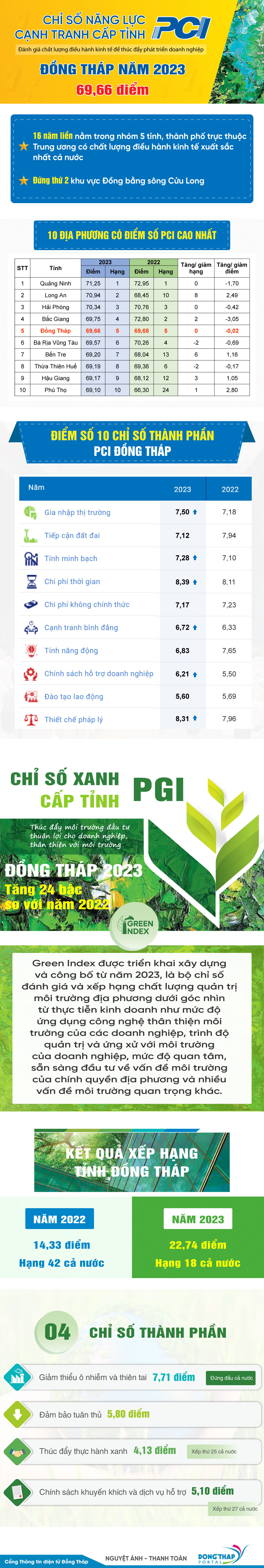 Sáng ngày 09/5, Liên đoàn Thương mại và Công nghiệp Việt Nam (VCCI) tổ chức Lễ Công bố Chỉ số Năng lực cạnh tranh cấp tỉnh (PCI) và Chỉ số Xanh cấp tỉnh (PGI) 2023. Mời xem infographic dưới đây về kết quả nổi bật PCI, PGI 2023 của tỉnh Đồng Tháp.