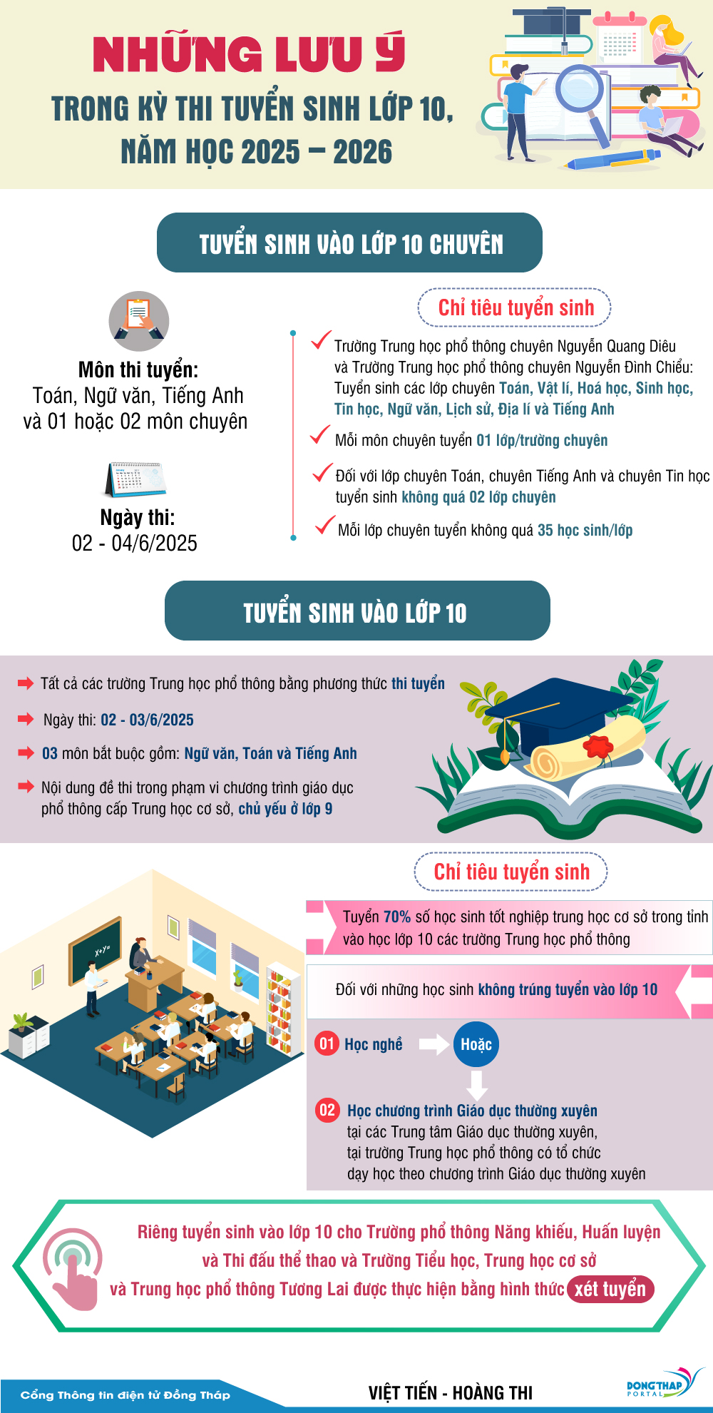 Năm học 2025 - 2026, Đồng Tháp sẽ tổ chức tuyển sinh lớp 10, lớp 10 chuyên bằng hình thức thi tuyển. Thí sinh cần lưu ý về mốc thời gian, môn thi, chỉ tiêu tuyển sinh trong kỳ thi này.