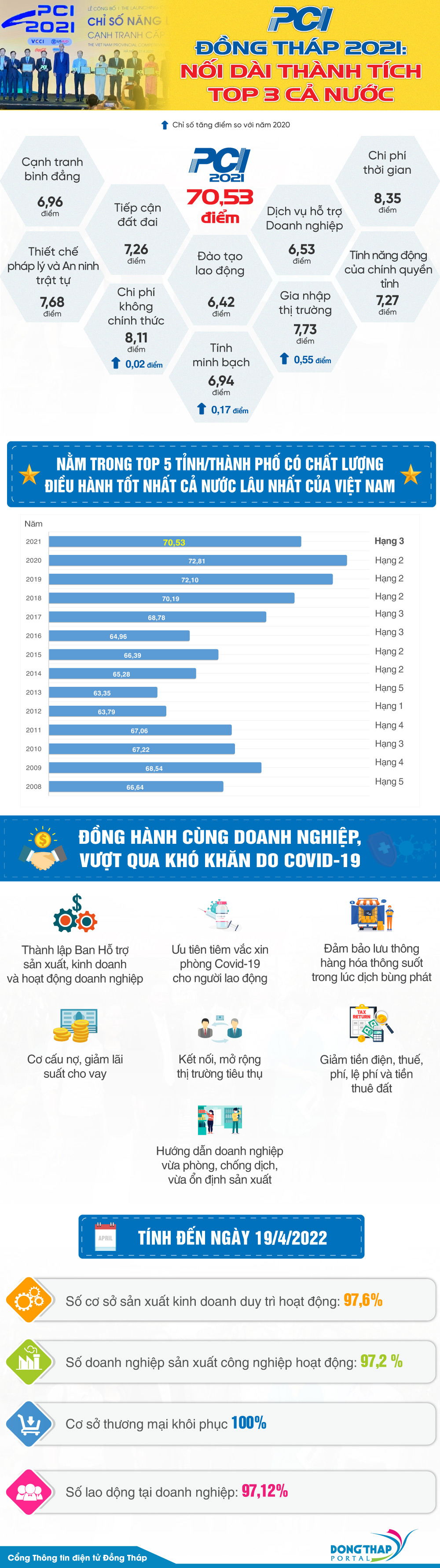 Với chủ trương đồng hành cùng nhiều hoạt động thiết thực hỗ trợ doanh nghiệp vượt qua 01 năm đầy khó khăn do Covid-19, môi trường đầu tư kinh doanh của Đồng Tháp tiếp tục được đánh giá cao. Kết quả PCI 2021, Đồng Tháp xếp thứ 3 cả nước và đứng đầu khu vực Đồng bằng sông Cửu Long với 70,53 điểm. Đặc biệt, cho đến thời điểm này, Đồng Tháp là tỉnh có thời gian nằm trong top 5 tỉnh/thành phố có chất lượng điều hành tốt nhất cả nước lâu nhất của Việt Nam.