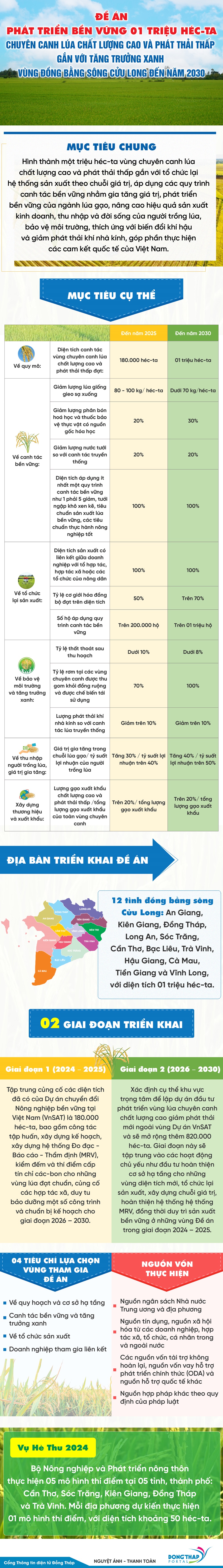 Đề án “Phát triển bền vững một triệu héc-ta chuyên canh lúa chất lượng cao và phát thải thấp gắn với tăng trưởng xanh vùng Đồng bằng sông Cửu Long đến năm 2030”, được Chính phủ ban hành nhằm tổ chức lại hệ thống sản xuất theo chuỗi giá trị, áp dụng các quy trình canh tác bền vững để gia tăng giá trị, phát triển bền vững của ngành lúa gạo, bảo vệ môi trường, thích ứng với biến đổi khí hậu và giảm phát thải khí nhà kính v.v..