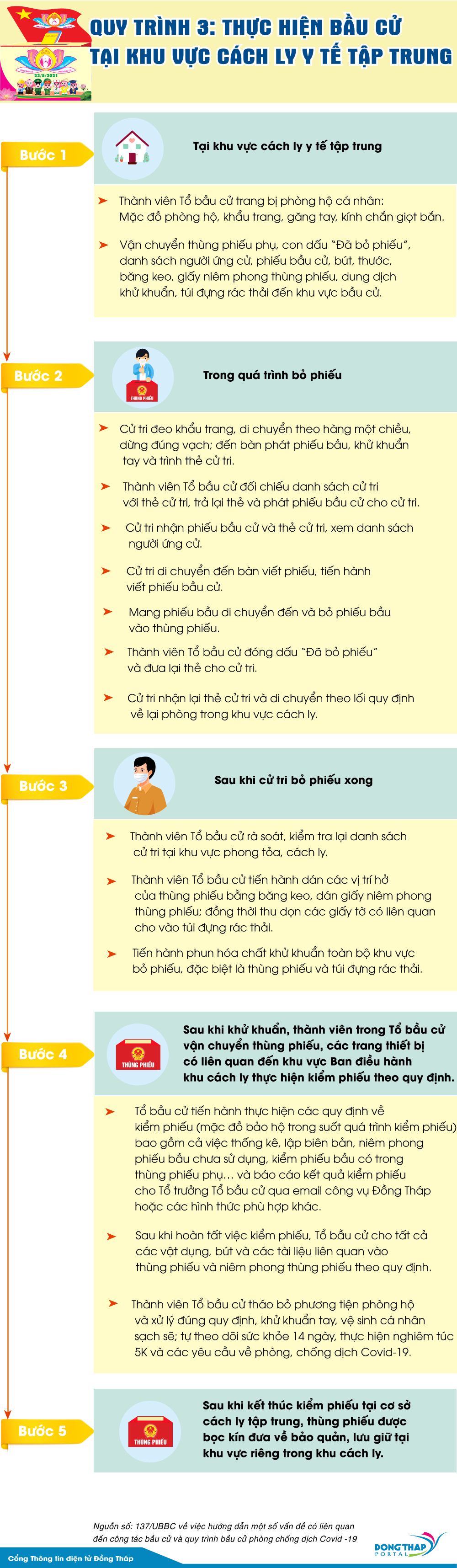 Thực hiện bầu cử tại khu vực cách ly y tế tập trung, ngoài các thành viên của Tổ bầu cử sẽ bổ sung thêm thành viên là người đang làm nhiệm vụ trong khu cách ly y tế tập trung. Cử tri và các thành viên Tổ bầu cử sẽ thực hiện bầu cử với 05 bước cụ thể như thế nào? Mời xem infographic dưới đây.