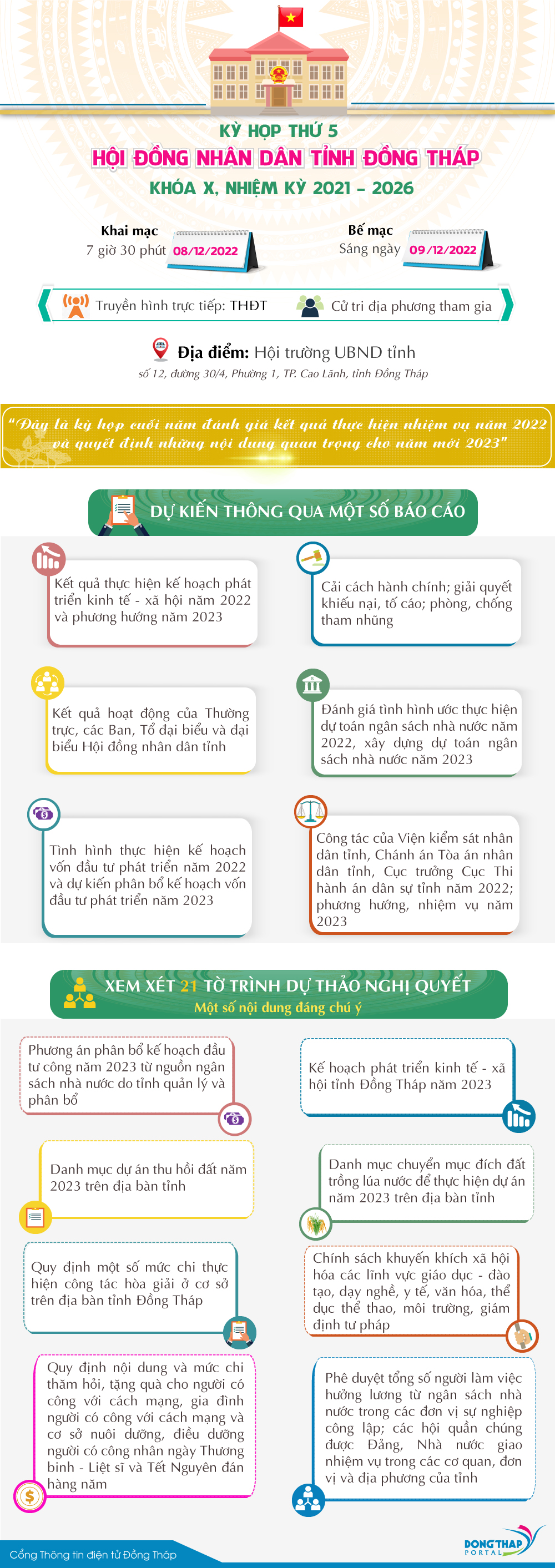 Hội đồng nhân dân tỉnh Đồng Tháp khóa X, nhiệm kỳ 2021 – 2026 sẽ tổ chức kỳ họp thứ 5 để đánh giá, xem xét và cho ý kiến nhiều nội dung quan trọng về kinh tế - xã hội tỉnh Đồng Tháp, đặc biệt là những kế hoạch, chính sách mới trong năm 2023.