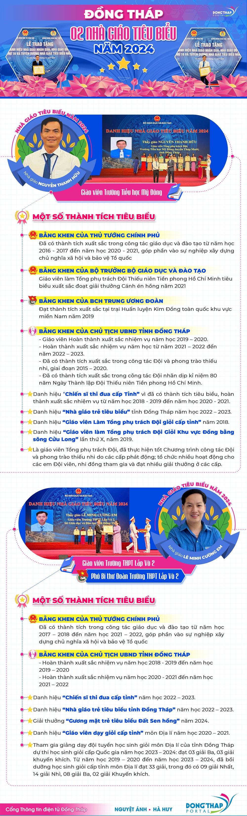 Bộ Giáo dục và Đào tạo vừa tổ chức trao Bằng khen của Bộ trưởng Bộ Giáo dục và Đào tạo cho 251 nhà giáo, cán bộ quản lý giáo dục tiêu biểu năm 2024. Tỉnh Đồng Tháp có 02 nhà giáo được vinh danh, đó là nhà giáo Nguyễn Thanh Hữu - Giáo viên Trường Tiểu học Mỹ Đông (huyện Tháp Mười) và nhà giáo Lê Minh Cường Em - Giáo viên Trường Trung học phổ thông Lấp Vò 2 (huyện Lấp Vò).