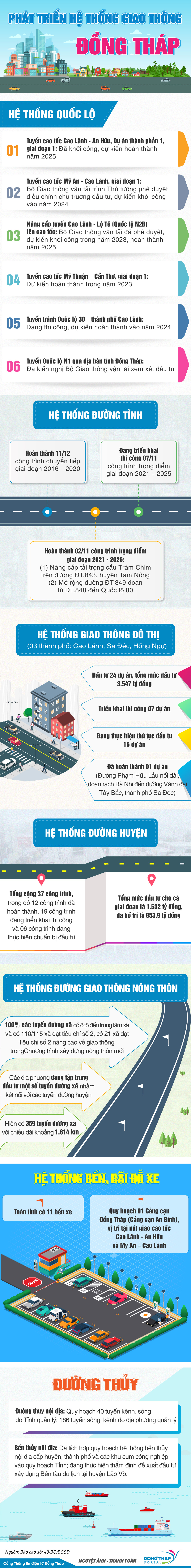 Tháng 9/2021, Ban Chấp hành Đảng bộ tỉnh Đồng Tháp khóa XI ban hành Kết luận số 203-KL/TU về định hướng xây dựng các công trình giao thông trọng điểm trên địa bàn tỉnh Đồng Tháp, giai đoạn 2021 – 2025, với mục tiêu phát triển mạng lưới giao thông đồng bộ, phủ khắp từ khu vực thành thị đến nông thôn, đến nay đã đạt một số kết quả tích cực. Dưới đây là Infographic về một số kết quả đạt được đến giữa nhiệm kỳ.