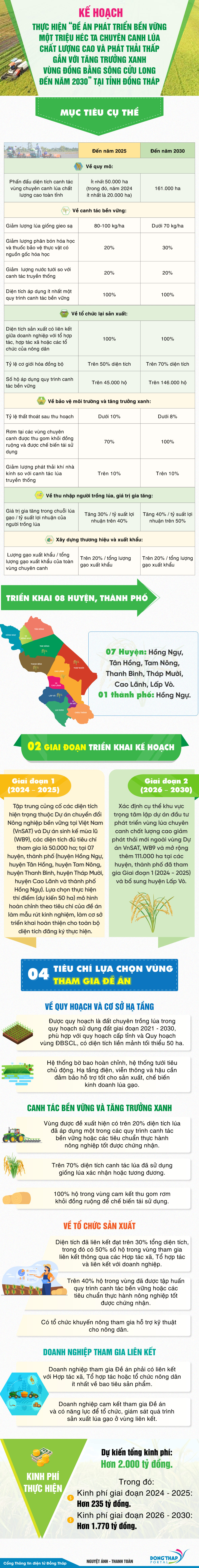 Ủy ban nhân dân tỉnh Đồng Tháp đã ban hành Kế hoạch thực hiện “Đề án Phát triển bền vững một triệu héc ta chuyên canh lúa chất lượng cao và phát thải thấp gắn với tăng trưởng xanh vùng Đồng bằng sông Cửu Long đến năm 2030”. Mục tiêu đến năm 2030, toàn tỉnh đạt 161.000 ha chuyên canh lúa chất lượng cao.