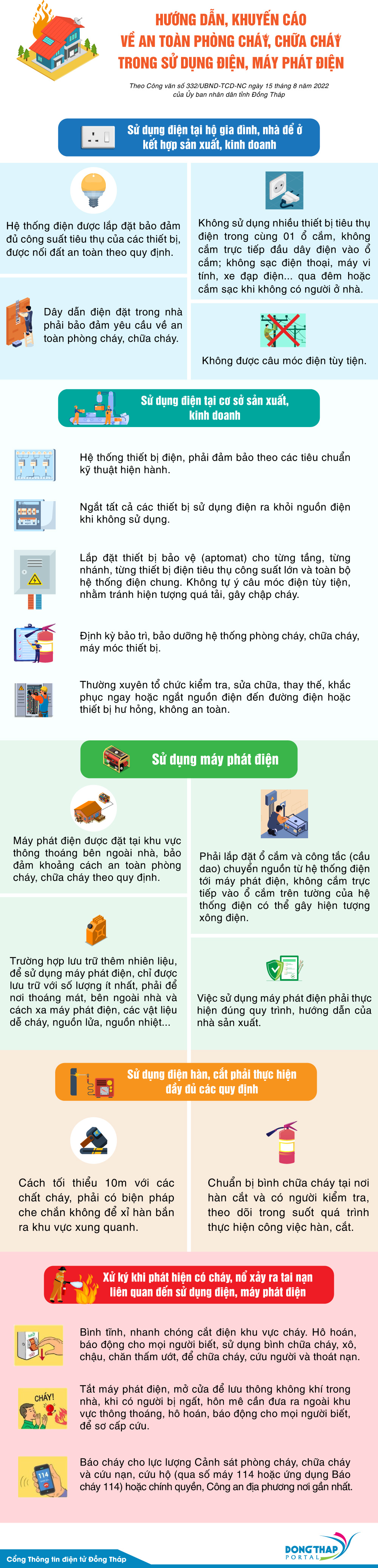 Thời gian qua, việc sử dụng các thiết bị không đúng quy định và không bảo đảm an toàn phòng cháy, chữa cháy đã làm phát sinh cháy, nổ, gây thiệt hại nghiêm trọng về người và tài sản. Để bảo đảm an toàn phòng cháy, chữa cháy, ngành chức năng hướng dẫn, khuyến cáo về an toàn phòng cháy chữa cháy trong sử dụng điện, máy phát điện. Mời xem Infographic dưới đây.
