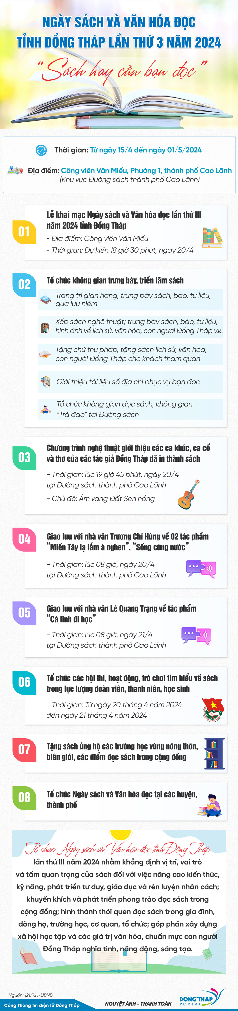 Ngày sách và Văn hóa đọc Việt Nam trên địa bàn tỉnh Đồng Tháp diễn ra từ ngày 15/4 đến ngày 01/5 với nhiều hoạt động phong phú và hấp dẫn, chính thức khai mạc vào tối 20/4 tại Công viên Văn Miếu. Mời xem chi tiết qua infographic dưới đây.