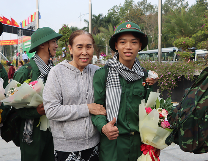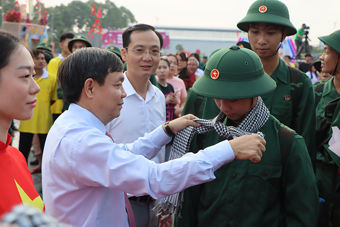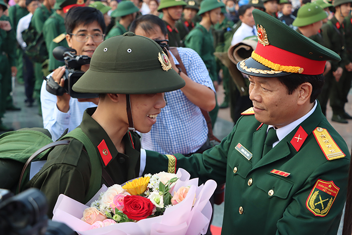 Tiễn các tân binh lên đường nhập ngũ, Chủ tịch Uỷ ban nhân dân tỉnh/ Chủ tịch Hội đồng nghĩa vụ quân sự tỉnh Phạm Thiện Nghĩa tặng hoa, động viên khích lệ tinh thần, chúc các tân binh mạnh khỏe, thực hiện tốt nghĩa vụ, trách nhiệm của công dân