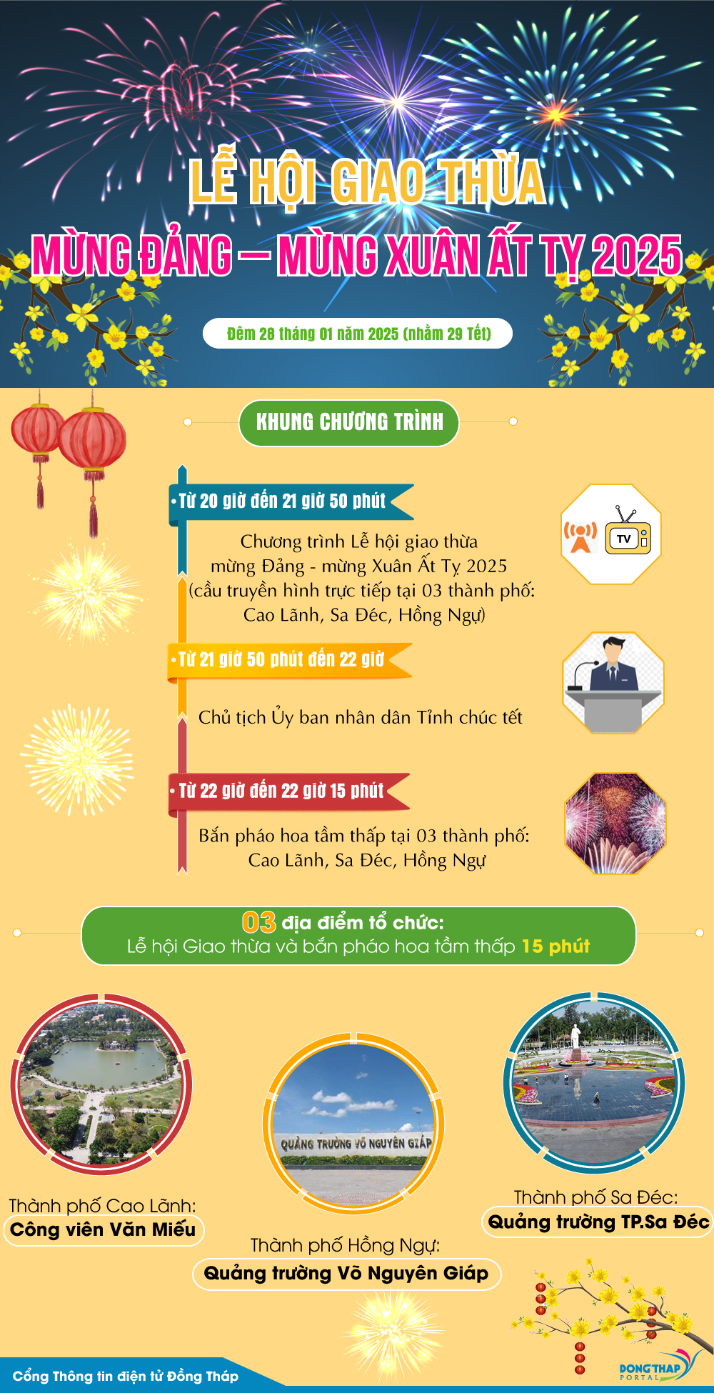 Mừng Đảng – mừng Xuân Ất Tỵ 2025, tỉnh Đồng Tháp sẽ tổ chức Lễ hội giao thừa và bắn pháo hoa tại 03 thành phố: Cao Lãnh, Sa Đéc và Hồng Ngự vào tối 28/01/2025 (đêm 29 Tết).