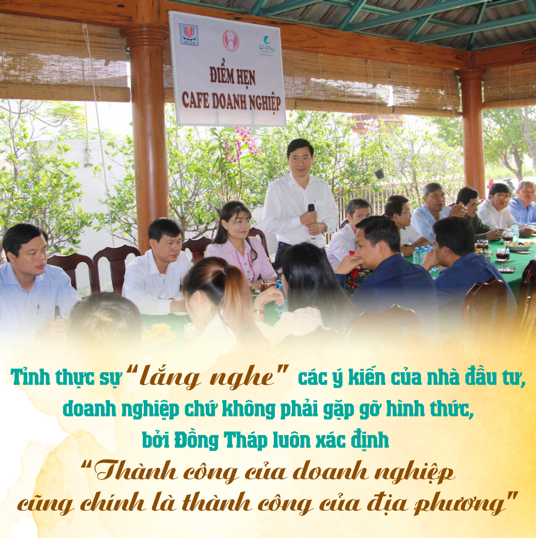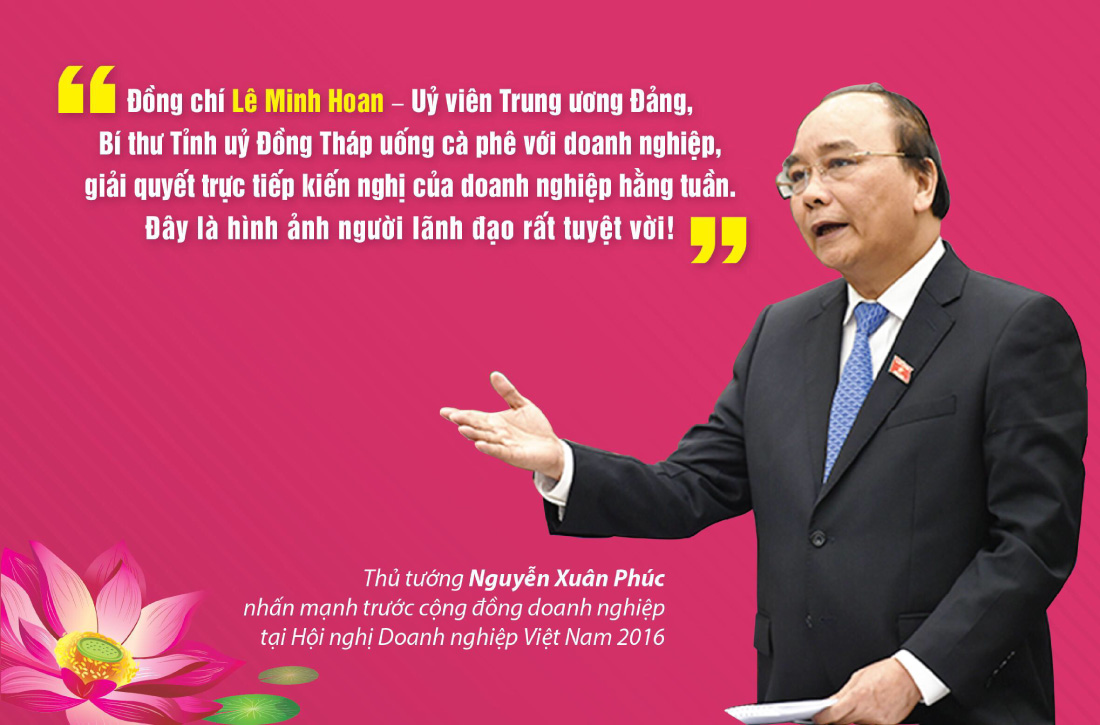 Phát biểu tại Hội nghị với doanh nghiệp vào ngày 29/4/2016, Thủ tướng Chính phủ Nguyễn Xuân Phúc hoan nghênh và biểu dương lãnh đạo tỉnh Đồng Tháp đã năng động, sáng tạo trong việc tháo gỡ khó khăn cho doanh nghiệp, qua việc tổ chức cà phê vào mỗi buổi sáng; đồng thời đề nghị người đứng đầu các tỉnh, thành trên toàn quốc phải tiếp doanh nghiệp hằng tháng.