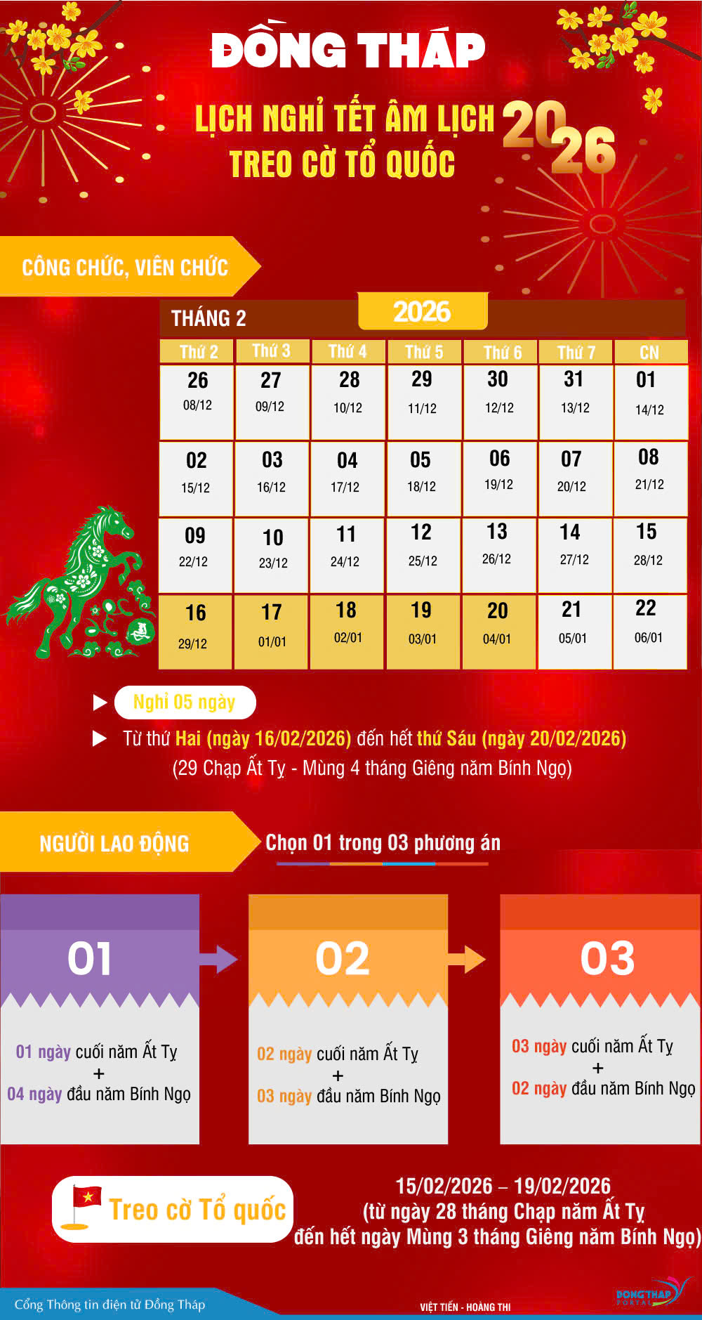 Theo Thông báo của Ủy ban nhân dân tỉnh Đồng Tháp, dịp Tết Âm lịch năm 2026, cán bộ, công chức, viên chức và người lao động của các cơ quan hành chính, sự nghiệp, tổ chức chính trị, tổ chức chính trị - xã hội được nghỉ 05 ngày, từ thứ Hai, ngày 16/02/2026 đến hết thứ Sáu, ngày 20/02/2026 (từ ngày 29 tháng Chạp năm Ất Tỵ đến mùng 4 tháng Giêng năm Bính Ngọ).