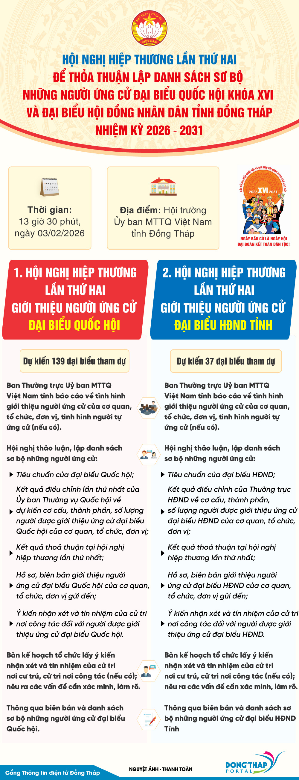 Để thỏa thuận lập danh sách sơ bộ những người ứng cử đại biểu Quốc hội khóa XVI, đại biểu Hội đồng nhân dân tỉnh nhiệm kỳ 2026 – 2031, Ban Thường trực Uỷ ban Mặt trận Tổ quốc Việt Nam tỉnh Đồng Tháp sẽ tổ chức Hội nghị hiệp thương lần thứ hai vào chiều ngày 03/02/2026.