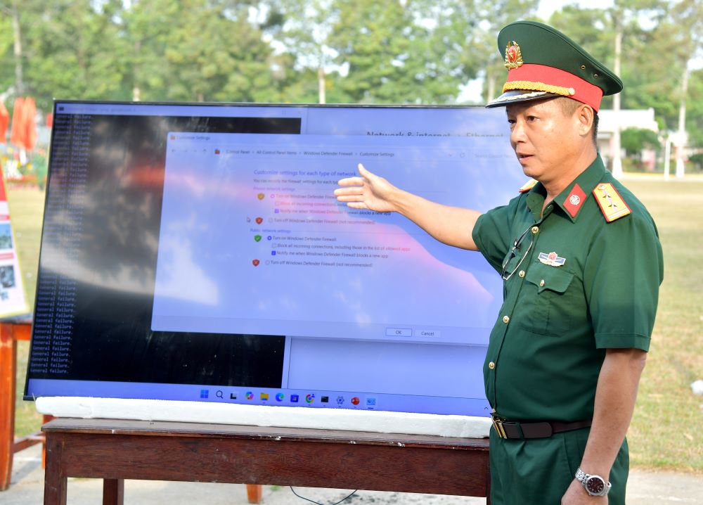 Trung tá Quân nhân chuyên nghiệp Nguyễn Phúc Thới - Phòng Tham mưu, Bộ Chỉ huy Quân dự tỉnh thuyết trình sản phẩm công cụ quản lý truy cập Internet trên máy tính quân sự